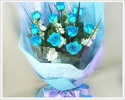 11枝藍(lán)玫瑰,情人草、蘭色加紫色縐紋紙包裝,緞帶打結(jié),圓形花束