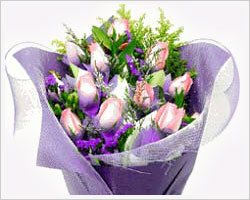 花材:13枝粉色玫瑰、勿忘我、黃鶯和情人草填充