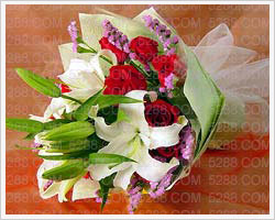 9枝紅玫瑰,2枝白色香水百合組成的花束。真誠(chéng)的我就像花蕊一樣的袒露在你的面前,請(qǐng)接受我一顆赤誠(chéng)的心和深情美好的祝福。