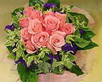 粉紅色玫瑰12枝,綠葉和勿忘我襯托